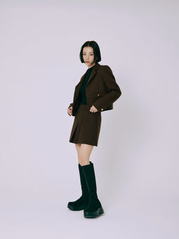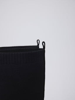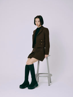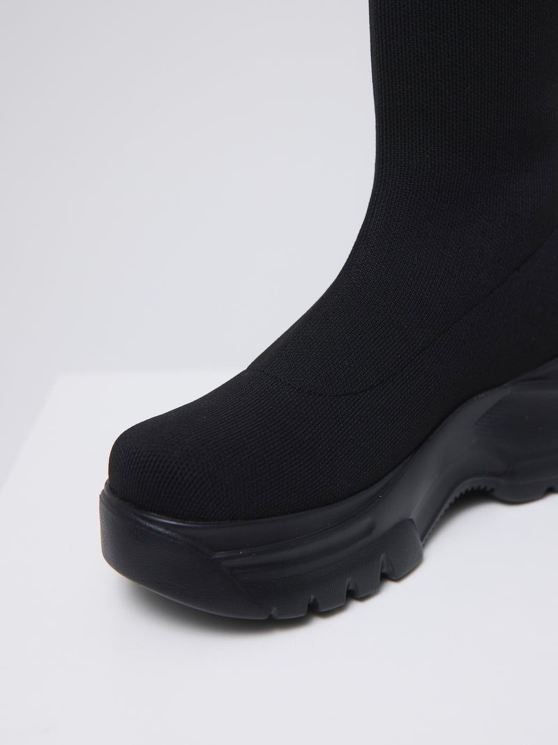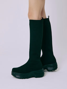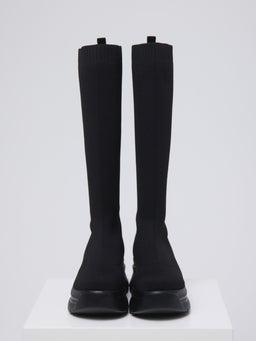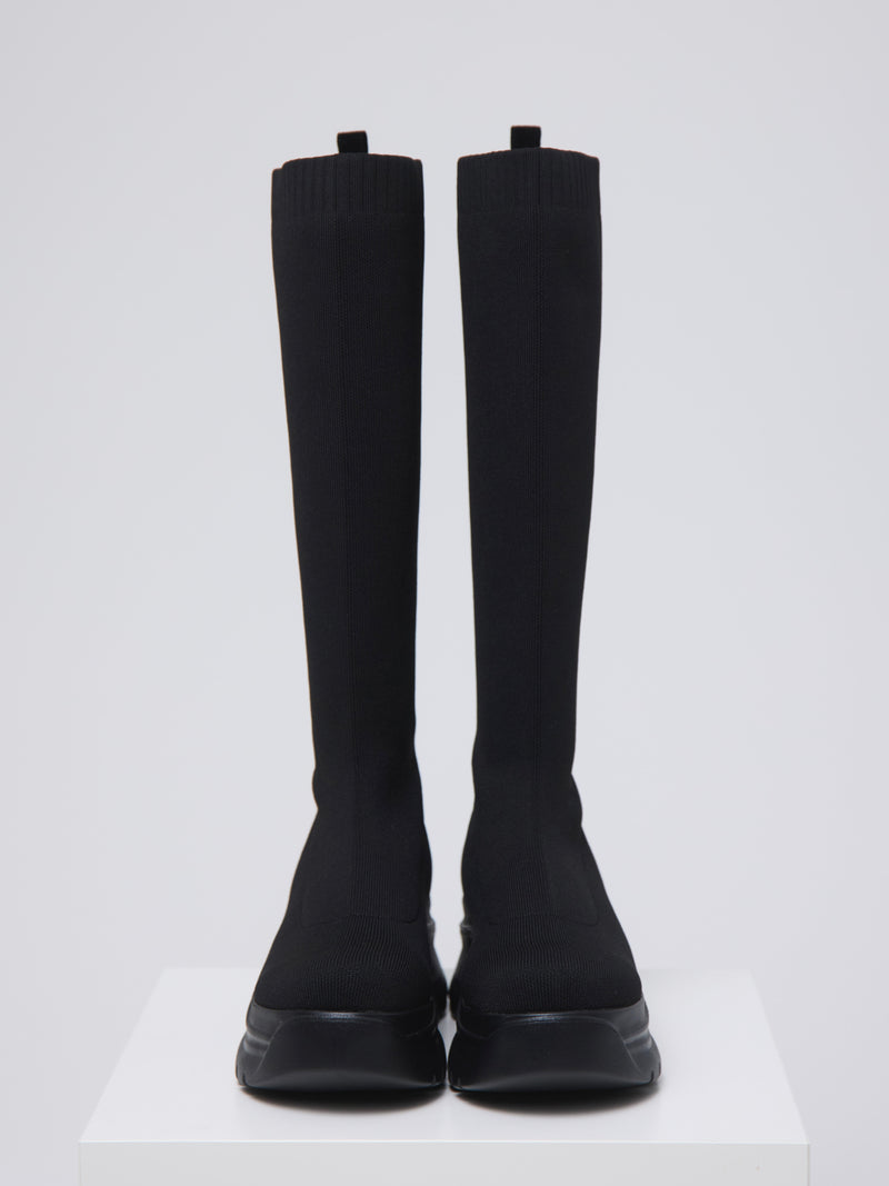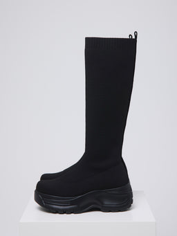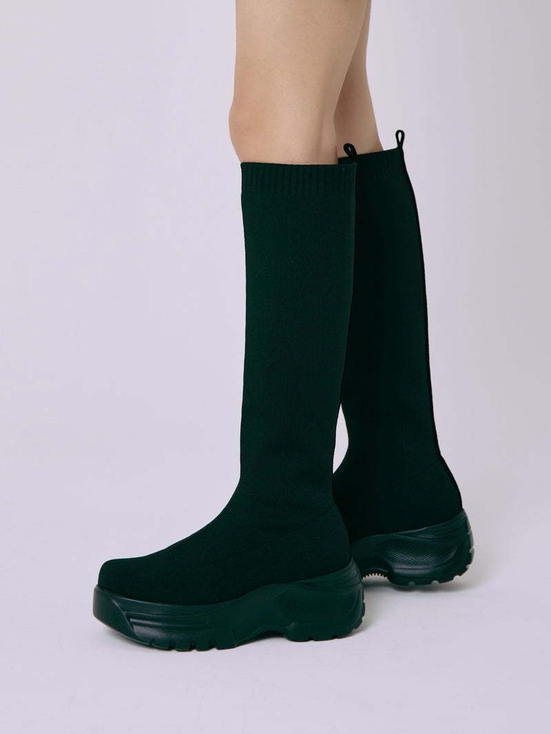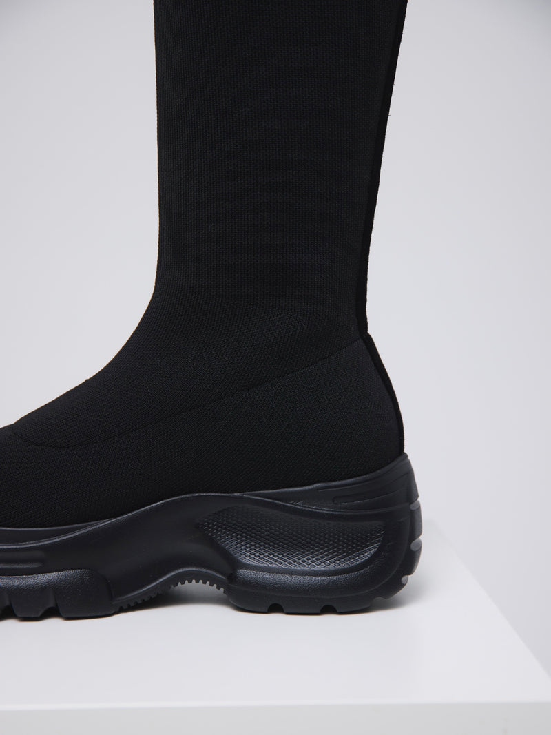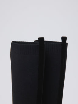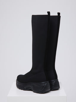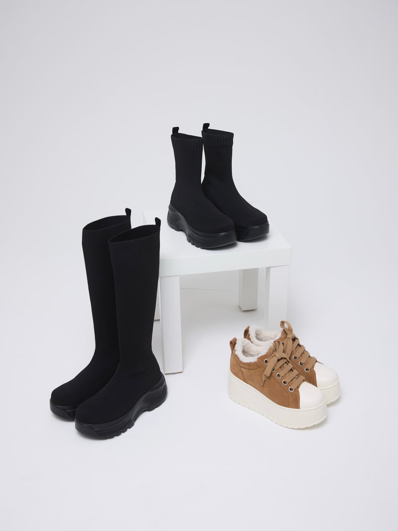 伸縮性のあるニット素材が脚全体をやさしく包み込み、ボリュームソールとの組み合わせでモードな印象に。